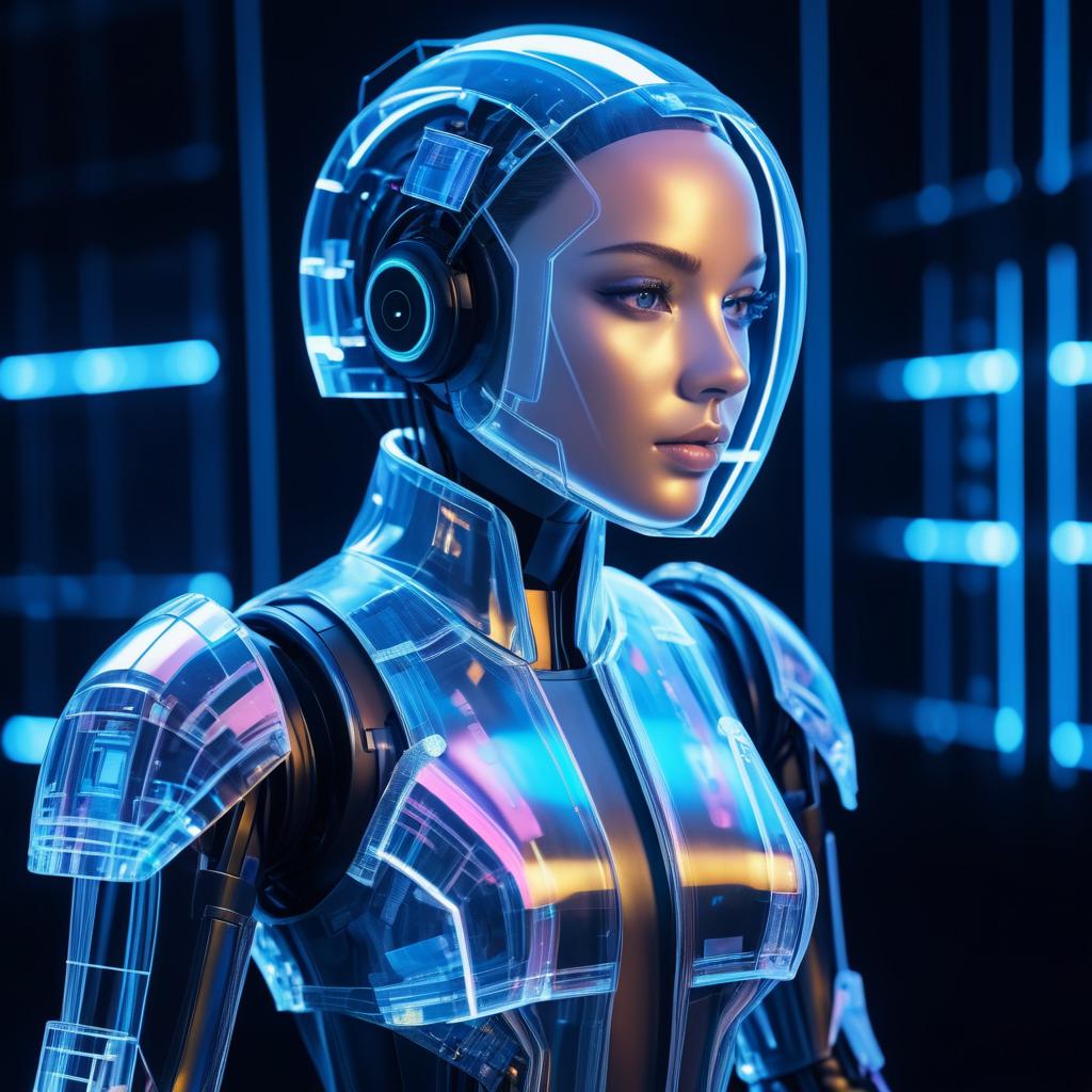 A futuristic scene featuring an android concierge in sleek metallic clothing, interacting with glowing holographic interface with floating rectangles, in a luxury futuristic hotel lobby, highly detailed, cinematic, hyper-realistic, inspired by sci-fi aesthetics
