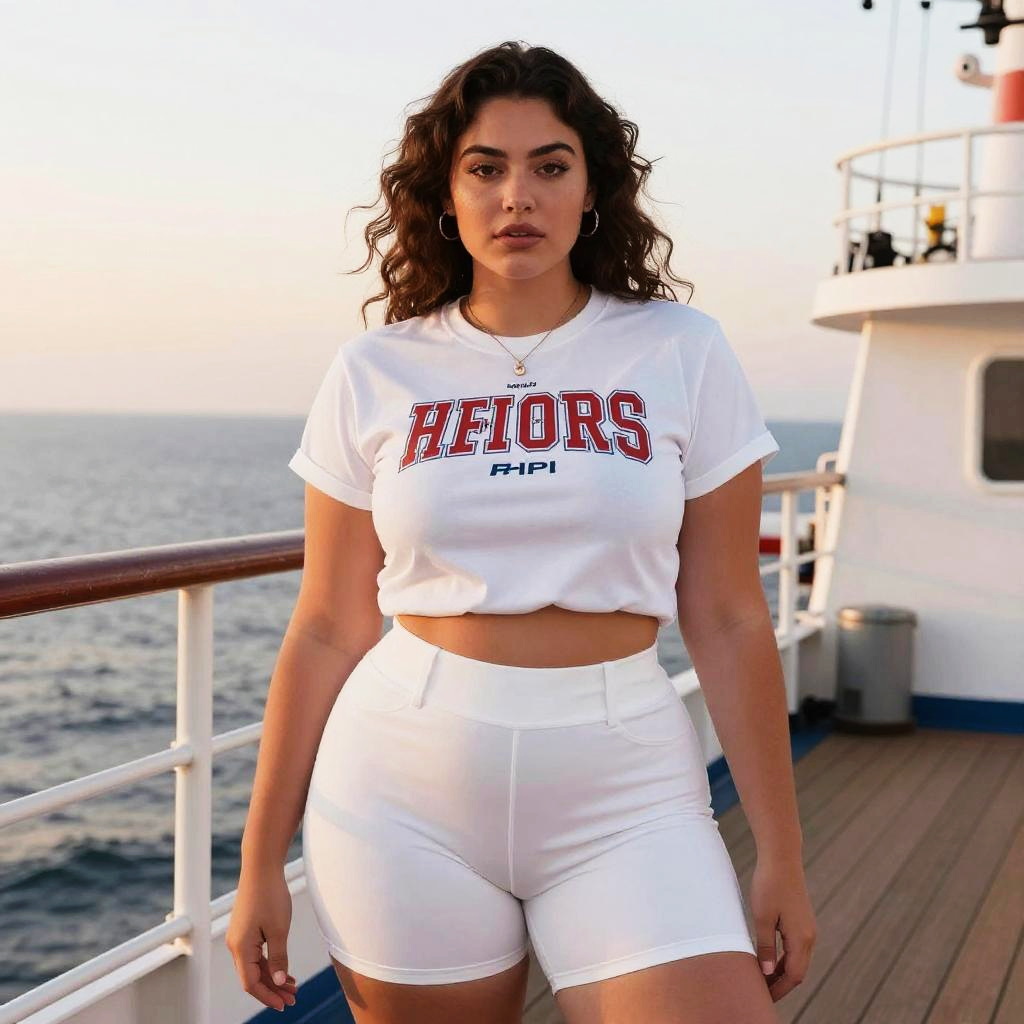 A lanky woman in casual streetwear, wearing a cropped white graphic t-shirt with bold lettering and high-waisted white cycling shorts, minimal jewelry with a simple necklace, stands on a ship deck during sunrise, captured in the vibrant visual style of ufotable. Sexy. Pretty face and beutiful eyes