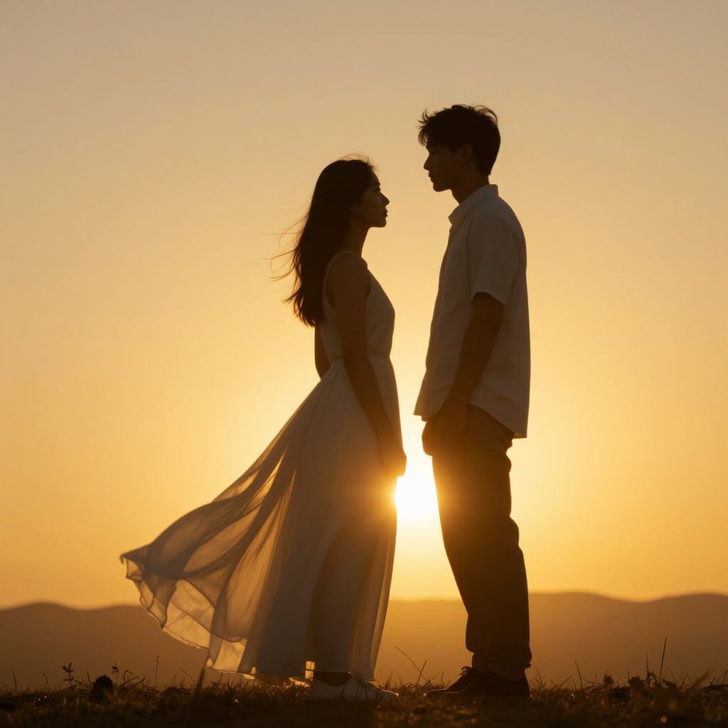 Silhouetted couple facing each other against a golden sunset, the woman in a flowing dress, the man in a shirt and pants, standing on