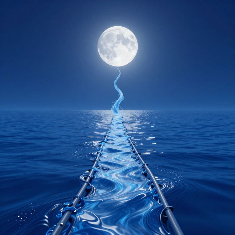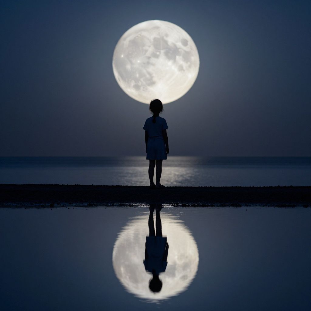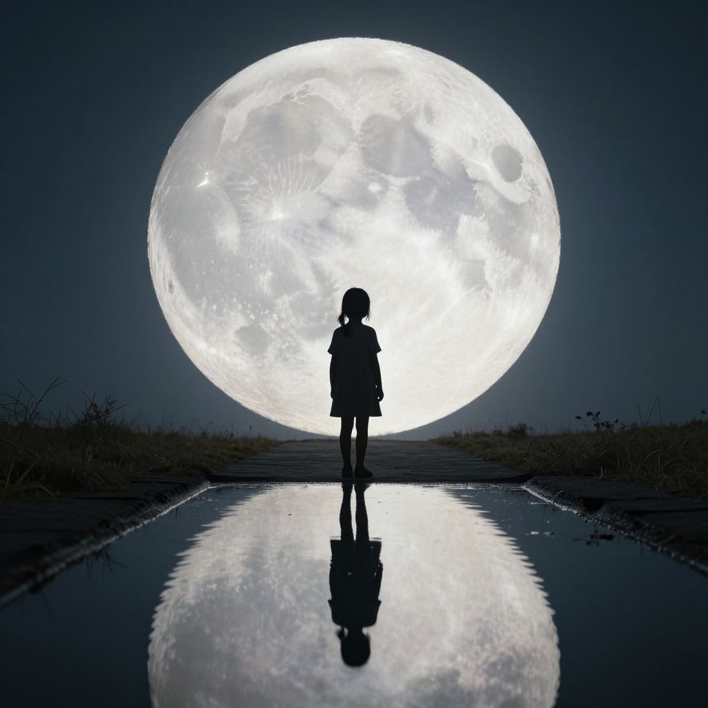 This digital artwork depicts a silhouetted figure standing on a spiral staircase that rises from calm, dark blue ocean waters. The staircase is centered, with the figure at the top, gazing at a large, luminous full moon that dominates the night sky. The moon casts a bright, white glow, creating a stark contrast with the deep blue hues of the ocean and sky. The figure's silhouette is simple and unidentifiable, adding a mysterious element to the scene. Ripples surround the base of the staircase, reflecting the moon's light. The overall composition is surreal and dreamlike, with a strong emphasis on the interplay between light and shadow.