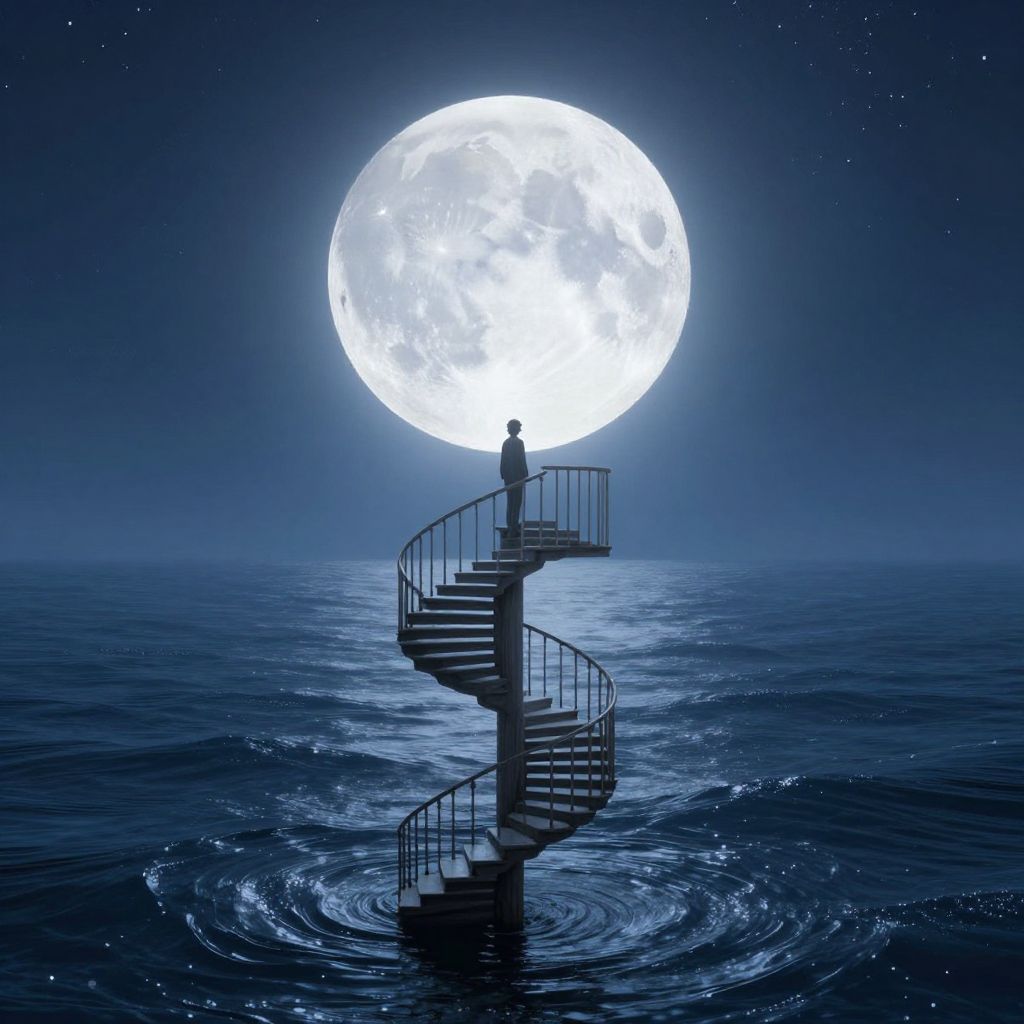 Suspended between the ethereal glow of a luminous moon and an ocean of floating dreams, a solitary spiral staircase ascends toward an unknown horizon, inviting introspection on the timeless journey of memory, longing, and the infinite expanse of human imagination.