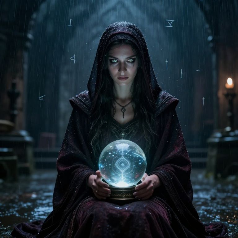 A digital fantasy artwork depicts a mysterious, dark-robed woman with glowing blue eyes, wearing a hood with small horns, holding a luminous crystal vial. She is centered, surrounded by dimly lit, ornate lanterns and various glass containers, including crystals and vials, on a dark wooden table. Her long, wavy hair cascades from beneath her hood. In the blurred background, shadowy figures in similar dark robes observe her. The scene is set in a dark, mystical forest, with ethereal blue and black hues dominating the image. The woman's intense gaze and the glowing crystals create a magical, enigmatic atmosphere.