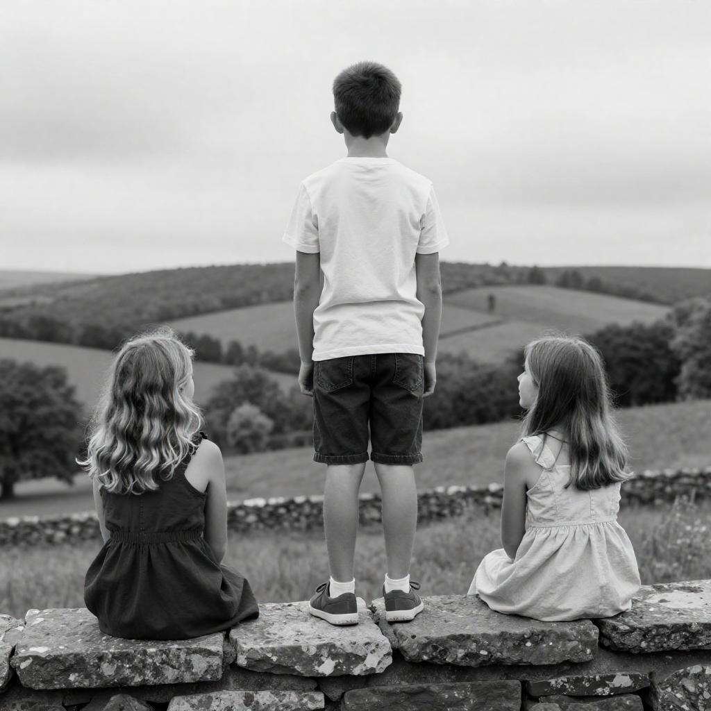 Black-and-white photograph of three children on a stone ledge overlooking a rural landscape. A boy in a white shirt and dark shorts stands confidently on the ledge, facing away. Two girls, one with wavy blonde hair in a dark dress and the other with straight brown hair in a light dress, sit on the ledge, looking up at him. The background shows rolling hills and scattered trees.
