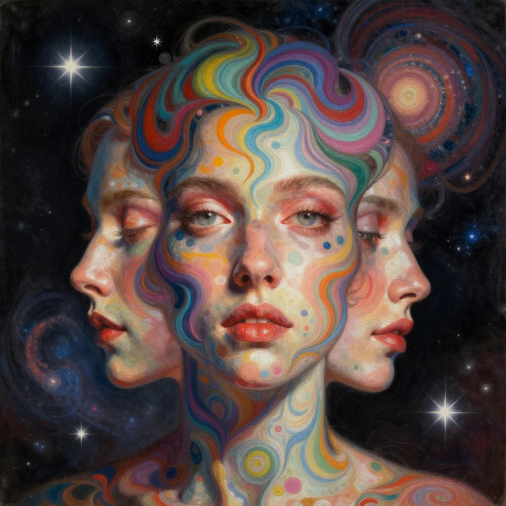 Digital painting of a triple-faced woman with swirling, colorful patterns on her skin, set against a starry, cosmic background.