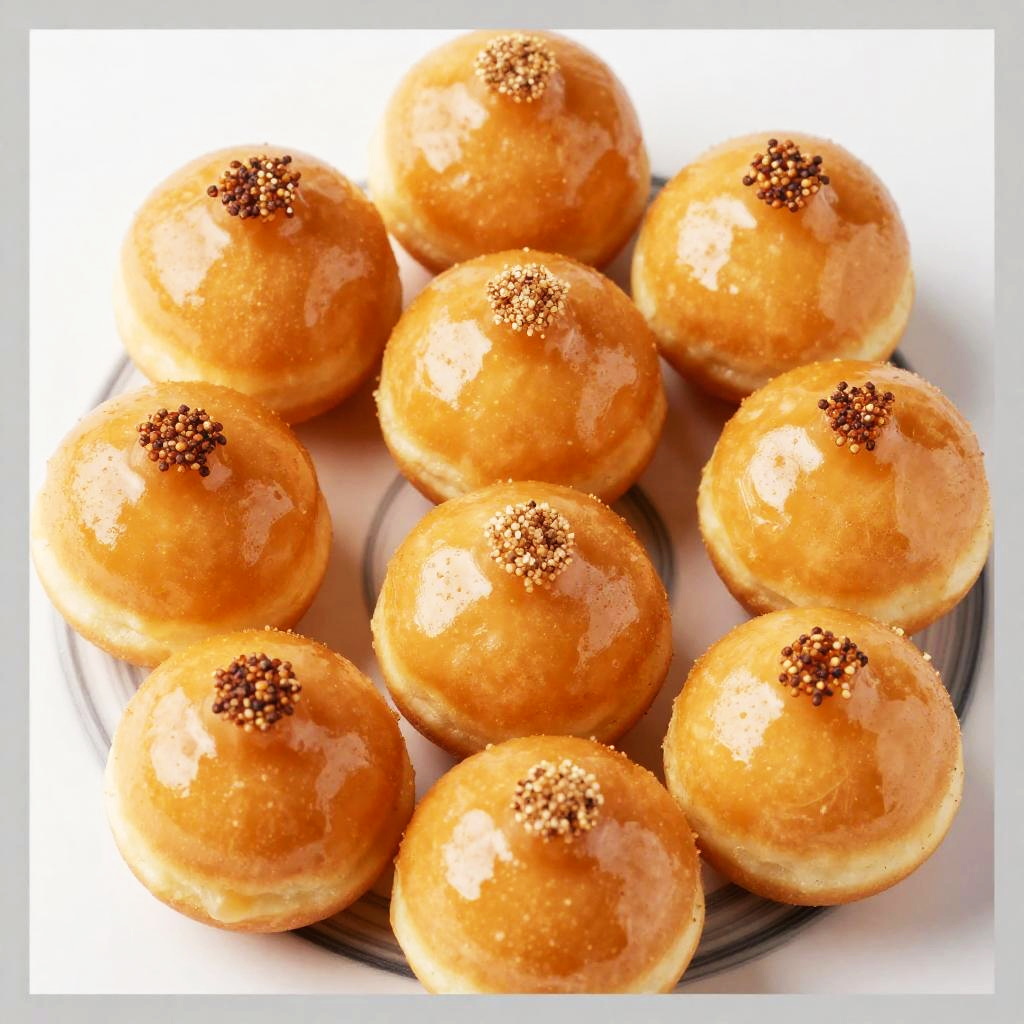 This is a close-up photo of nine golden-brown, shiny, glazed doughnuts with small brown sugar or nut-topped peaks. They're arranged on a white surface with black swirls. The doughnuts have a smooth, glossy texture and are slightly oval-shaped. The image has a bright, high-contrast look with a white background and gray borders.