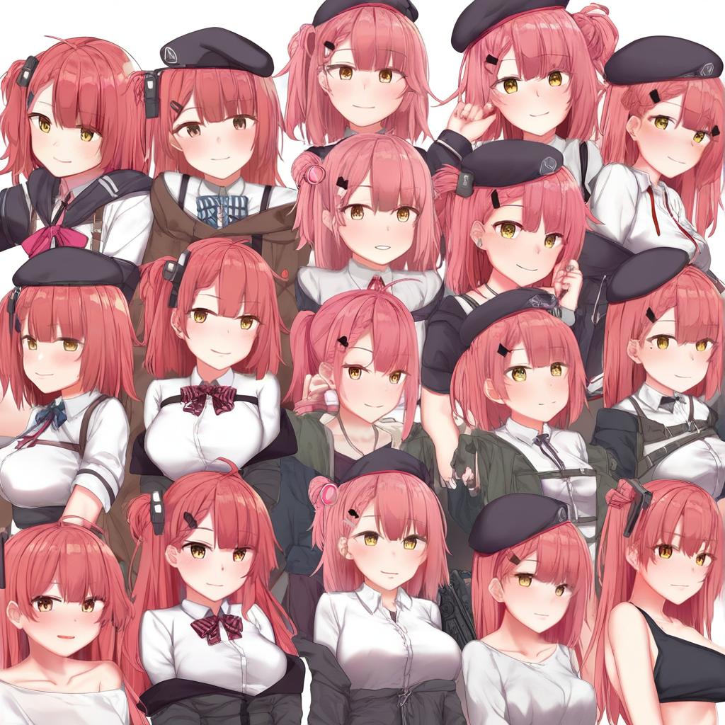 Mp7 (girls' frontline), girls' frontline, 1girl, yellow eyes, red hair, medium hair, pink hair, ahoge, ponytail, side ponytail, medium breasts, white shirt, off shoulder, submachine gun, one side up, beret, by artist jack dempa, leet