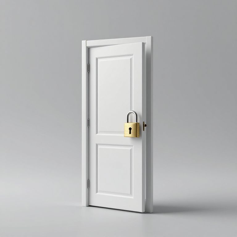 Photorealistic digital image of a plain white door centered in a minimalistic, light gray room. The door has a simple, rectangular design with two panels and a black handle on the right side. A yellow padlock is secured on the handle, suggesting the door is locked. The door and floor cast subtle shadows, adding depth to the image. The background is uniformly gray, emphasizing the door and padlock as the focal points. The overall style is clean and modern.