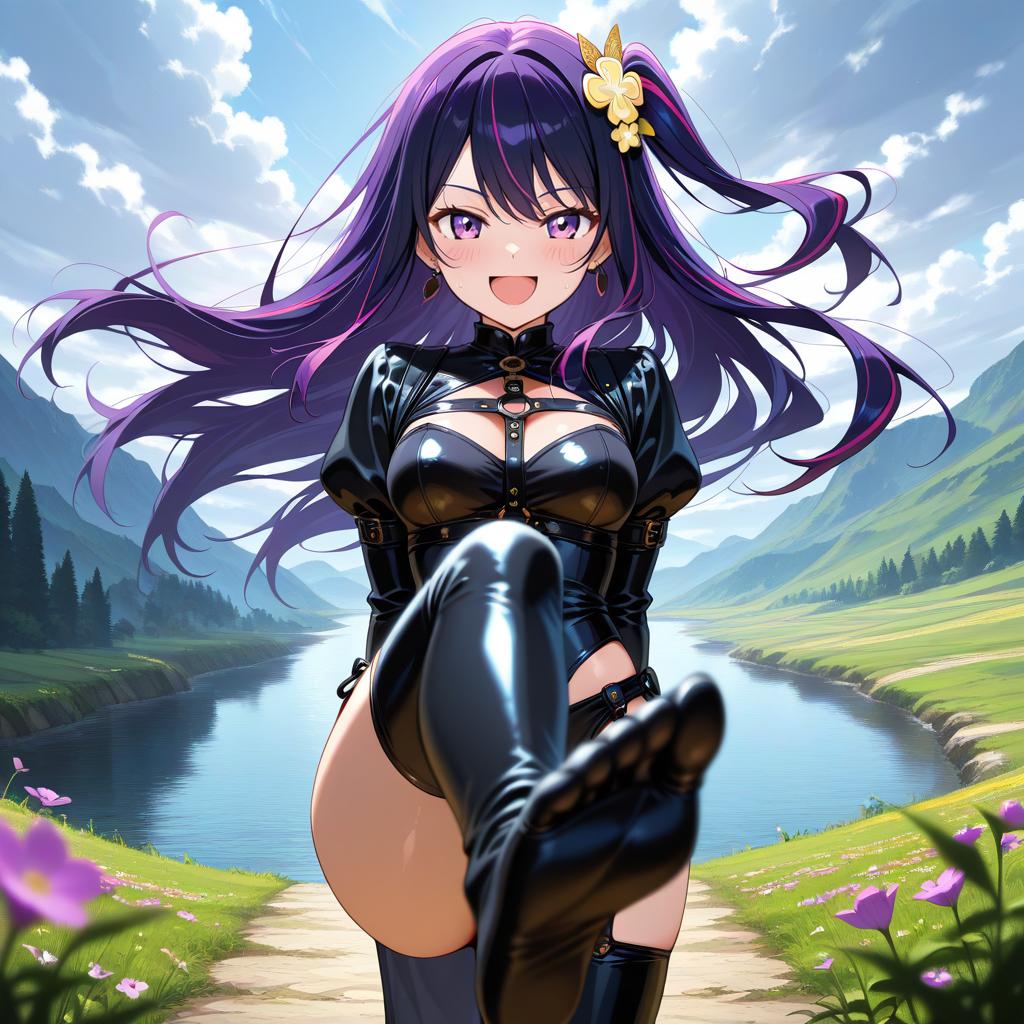 Anime film, animated film poster, animated movie poster, sunshinne on face, shiny face, 1girl, landscape, panorama, overlook, (high contra BREAK 0.8), (distant view), blurry foreground, wind, cowboy shot, Hoshino Ai, long hair, purple hair, streaked hair, purple eyes, star-shaped pupils, hair ornament, laughing, open mouth, bondage outfit, foot focus, convenient leg, Medieval, out of frame, cloudy, petunia \(flower\), river, masterpiece, highres, extremely detailed CG unity 8k wallpaper, best quality, ultra-detailed