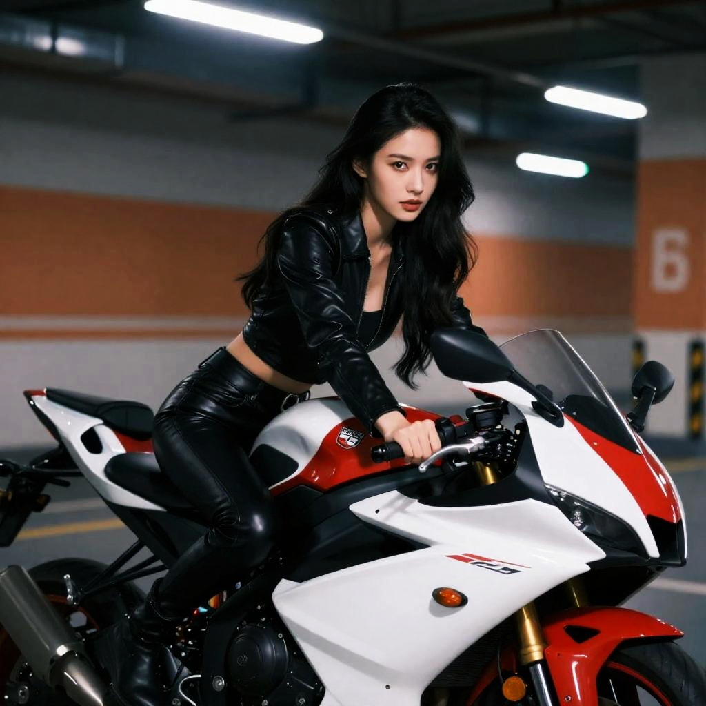 Photograph of a young woman with long brown hair, wearing a black jacket and pink top, sitting on a black motorcycle at night. Her expression is neutral. She wears black gloves and has a backpack. The background is blurred with city lights.