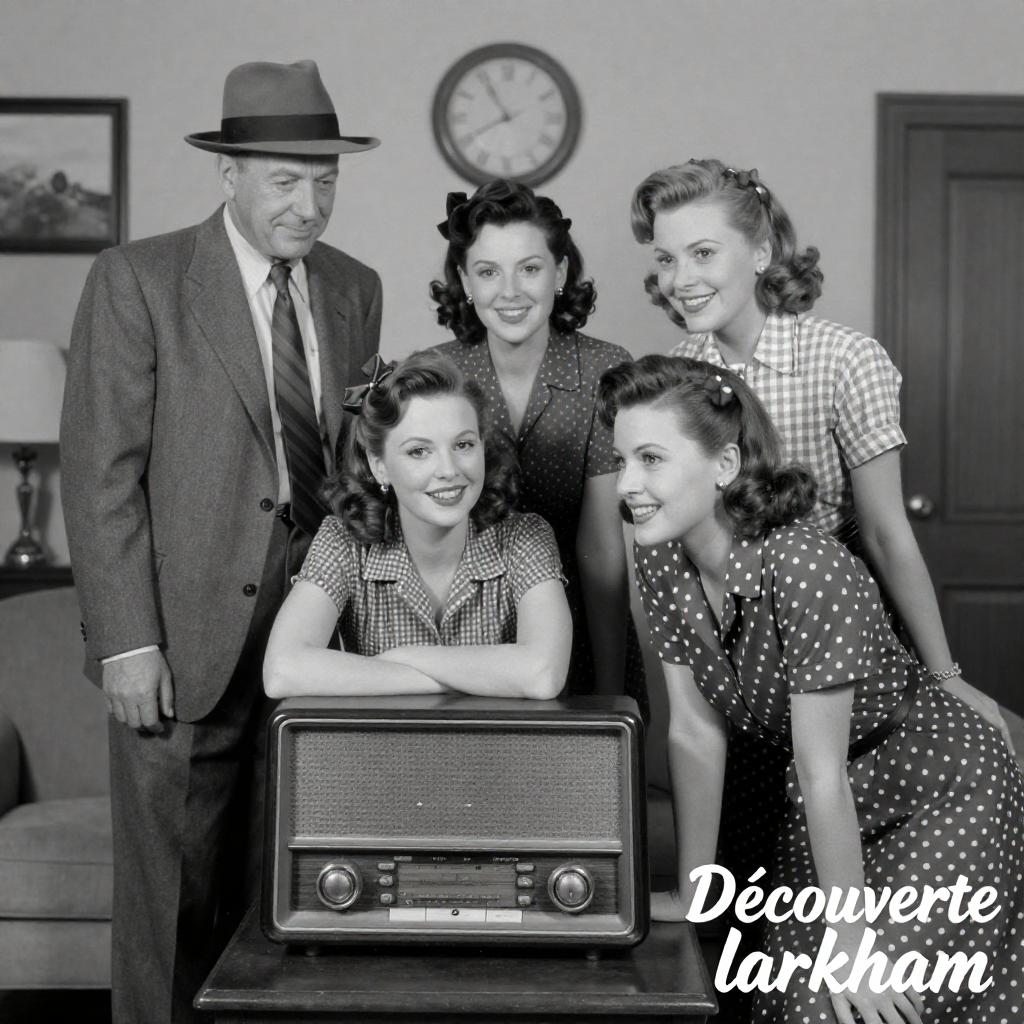 Black-and-white photograph of five people in 1940s-style clothing, gathered around an old radio in a living room. One man in a hat and suit stands left, four others lean forward, smiling. Polka-dot dresses, checkered shirts. Retro decor. "Découverte l'Arkham" in bottom right.