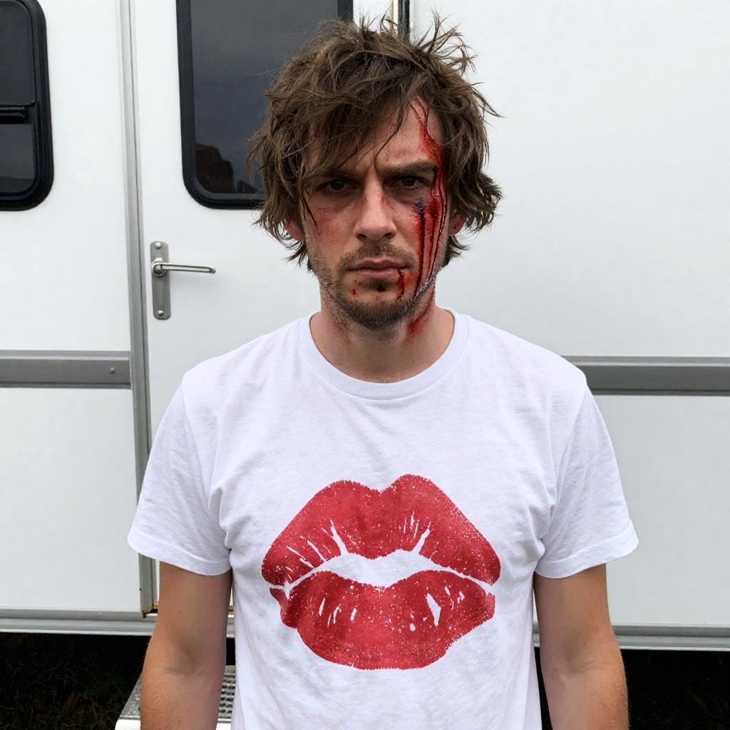 Man with messy brown hair, blood on face, wearing white t-shirt with red lipstick prints, standing outside white trailer. Intense expression. Background: white trailer door, steps. Casual, distressed appearance. Blood drips down face. Daylight.