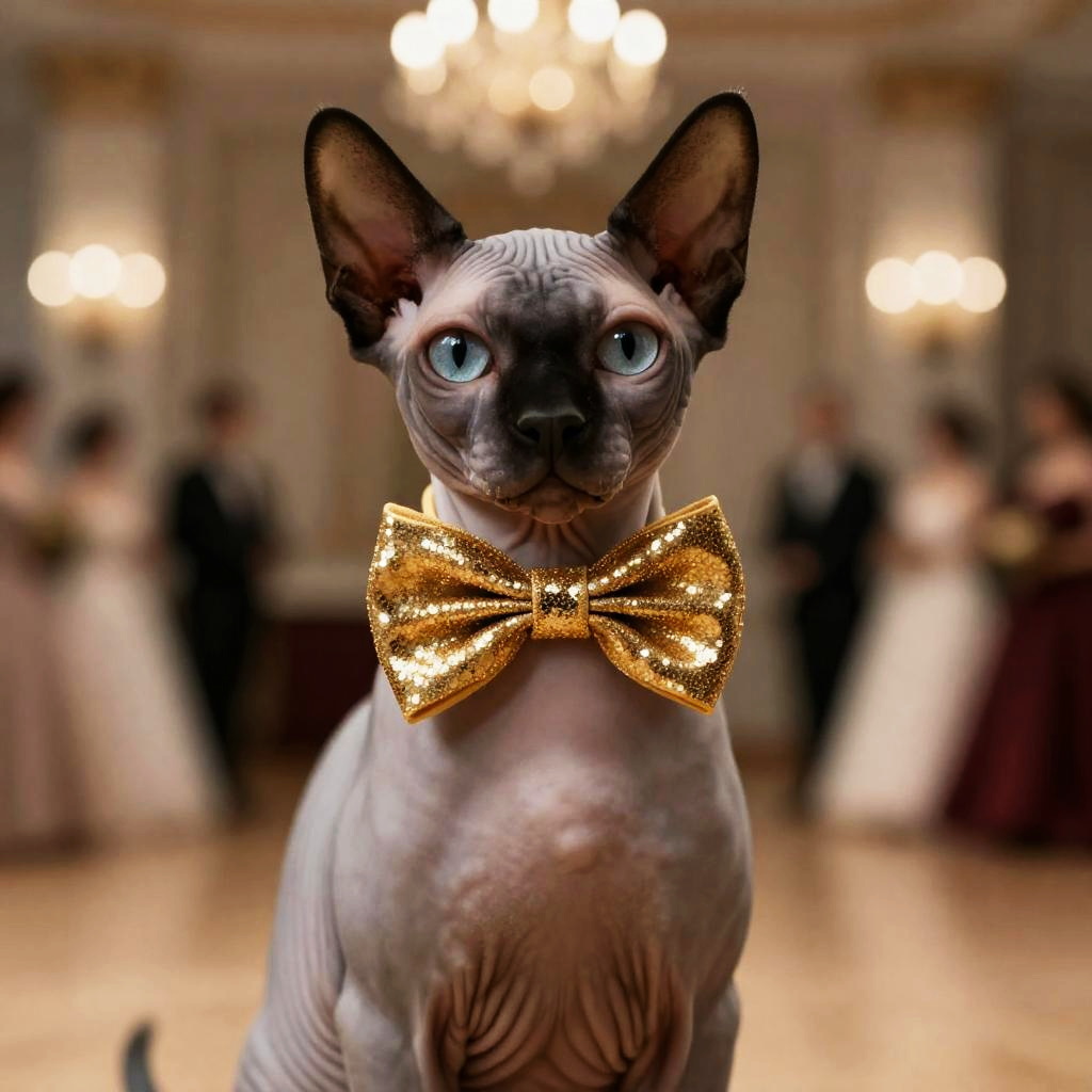 Realistic photo.Sphynx cat wearing a gold sequined bowtie with elegant ballroom background, facing camera, waist up, cinematic, 35mm lens, f/1.8, 16k, accent lighting, global illumination, professional color grading, soft shadows, no contrast, f-stop 1.2, depth of field, focus stacking. realistic photo