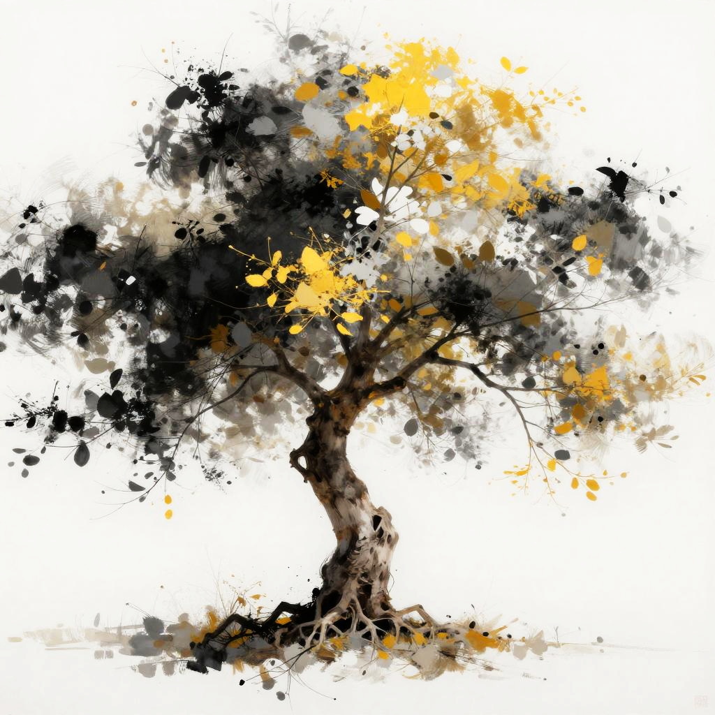 This is a digital watercolor-style painting of a tree with a thick, twisted trunk and branches. The tree is adorned with splashes of black, white, and yellow leaves, creating a dynamic contrast. The background is predominantly white, allowing the vibrant colors of the leaves and dark branches to stand out. The black and white splatters give a sense of abstract expression, while the yellow leaves add a touch of warmth and balance. The overall effect is a striking, modern interpretation of a tree, blending realistic elements with abstract art techniques.