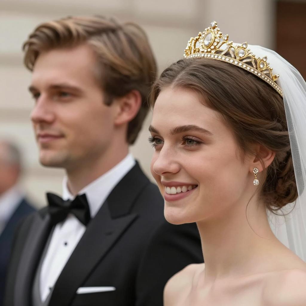 Photograph of a married couple. Man with dark, wavy hair, fair skin, black suit, white shirt, black tie with white dots, white boutonniere. Woman with blonde hair, fair skin, white headband, white veil with gold embroidery, yellow earrings, smiling. Both looking at camera, slightly leaning towards each other. Bright background.