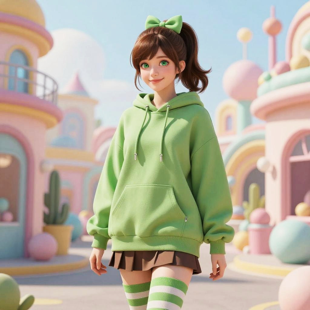 Digital artwork of a cute anime-style girl with fair skin and large green eyes. She has brown hair in a high ponytail with a green bow. She wears a green hooded sweatshirt, a short black and white striped skirt, and green and white striped thigh-high socks. The background features a whimsical, pastel-colored town with rounded buildings, potted cacti, and a bright blue sky. The overall style is vibrant and cartoonish, with soft, smooth textures and a cheerful atmosphere. The girl stands confidently in the center, smiling gently.
