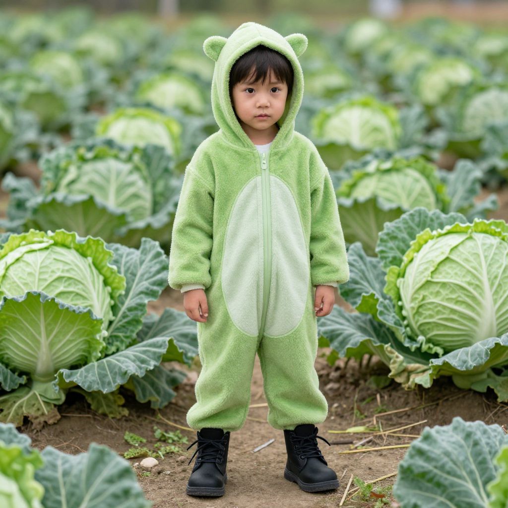 Photograph of an Asian toddler standing in a lush cabbage field. The child has black hair and wears a light green, zip-up, fuzzy onesie with bear ears and a large white patch on the front, resembling a cabbage. The onesie covers the child entirely, excluding their black boots. The background is filled with large, green cabbage plants with dark green leaves. The toddler stands on a dirt path with patches of grass. The image has a soft focus, adding a dreamy quality to the scene. The child's expression is neutral, and the overall atmosphere is calm and natural.