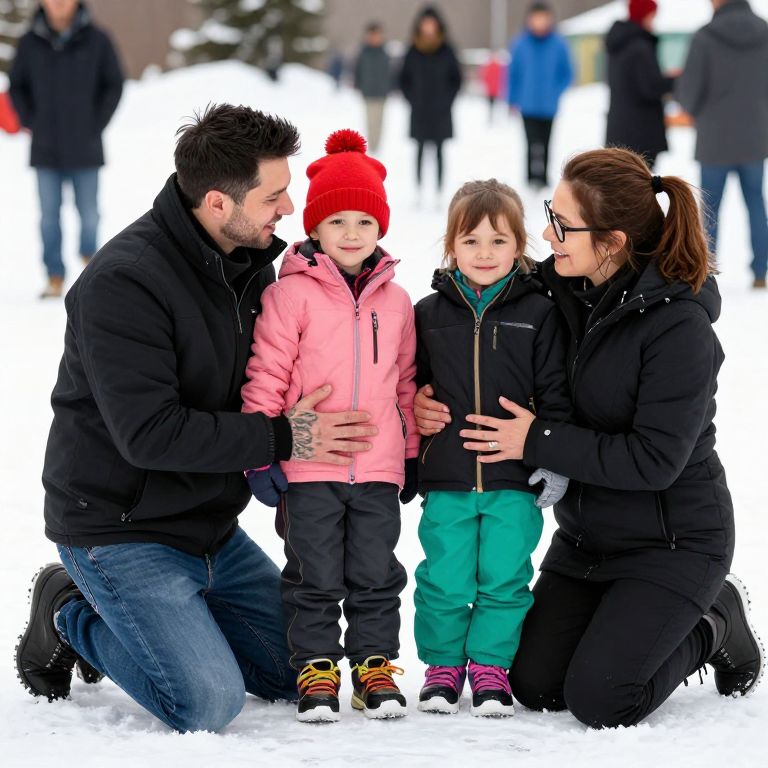 Photograph of a family of four kneeling in the snow. The dad, with tattoos on his left arm and short dark hair, wears a black jacket and jeans, smiling at his son in a pink jacket and red hat. The mom, with brown hair in a ponytail, wears glasses and a black jacket, smiling at her daughter in a black jacket and green pants. The kids are standing in the center, being hugged by both parents. Background shows blurry people and snow-covered ground.