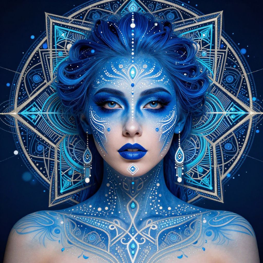 This captivating artwork features a woman with striking blue face paint, surrounded by intricate designs and geometric patterns that evoke a sense of ethereal beauty. The composition blends elements of fantasy and surrealism, highlighting the contrast between vibrant colors and delicate details.