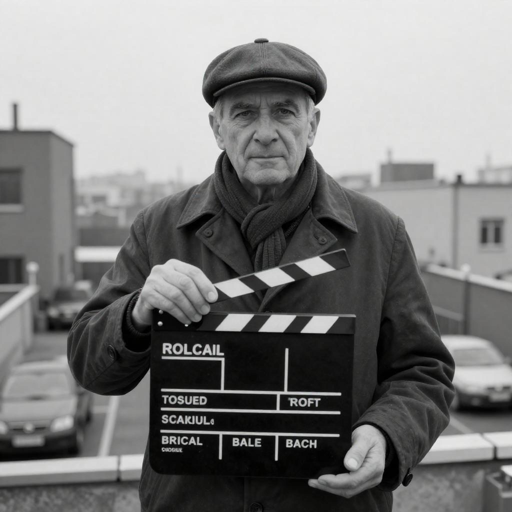 Black-and-white photograph of an older man with a flat cap, dark coat, and scarf, holding a clapboard. He stands on a rooftop with urban buildings and parked cars in the background. He has a neutral expression. The clapboard is positioned in front of him, partially covering his chest. The man is centered in the frame.