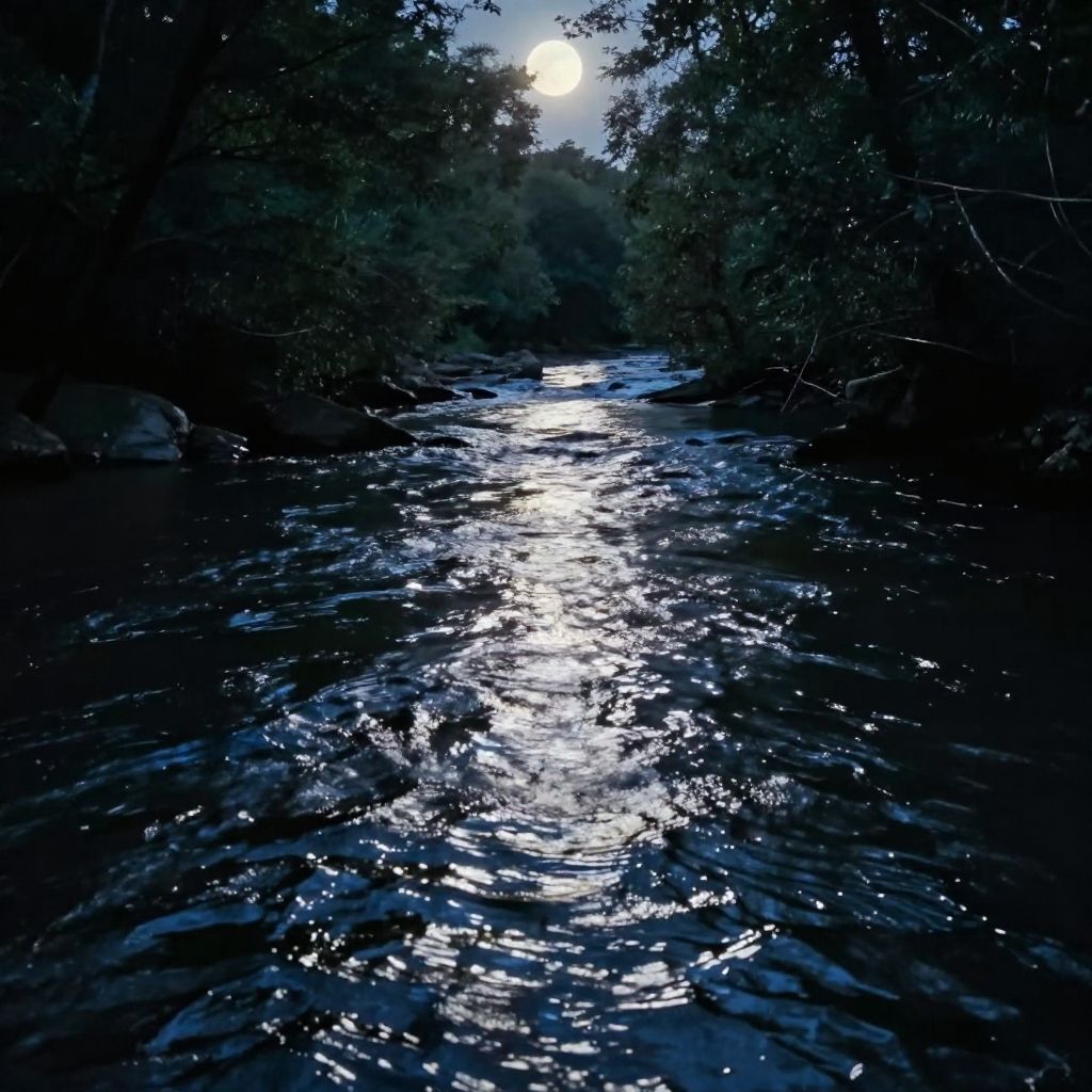 Moonlight reflection on water, quiet river flowing through a forest with silver light dancing on the surface, mystical ambiance, soft shadows and luminous highlights