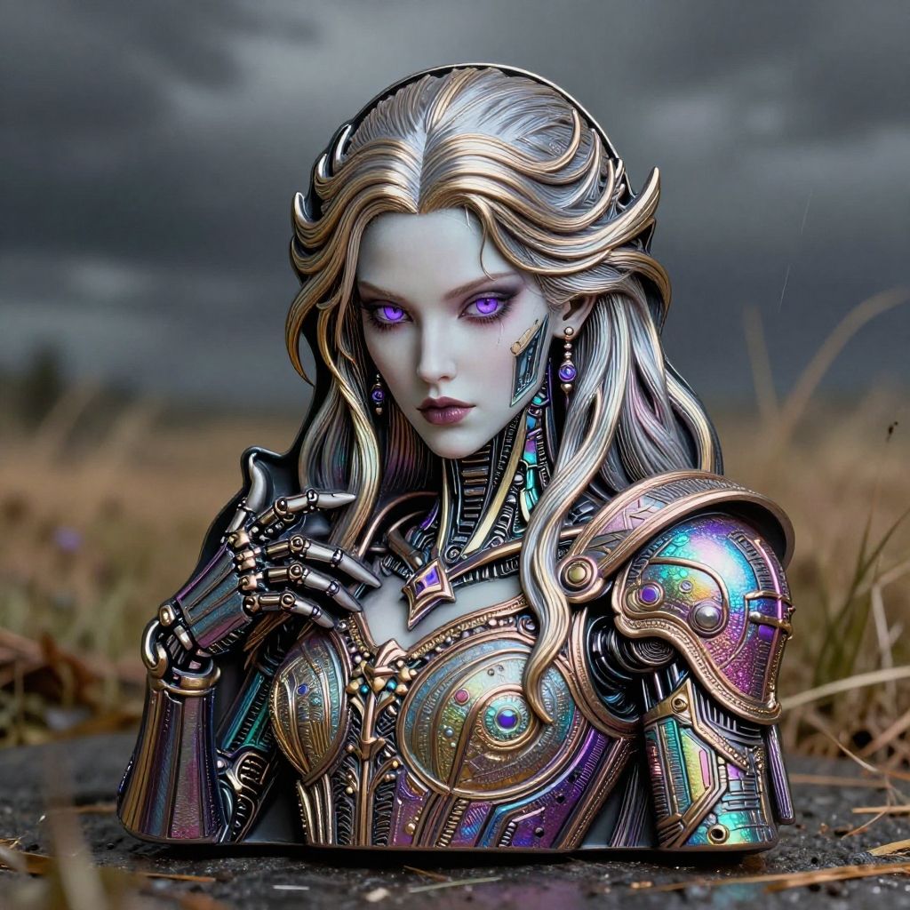 Digital artwork of a pale-skinned, ethereal female character with long, wavy, platinum-blonde hair and striking purple eyes. She wears intricately designed, iridescent armor with metallic textures, featuring colorful, holographic patterns. Her expression is solemn, with a slight touch of melancholy. The background is a blurred, stormy sky and a grassy field, creating a dramatic, moody atmosphere. The image has a hyper-realistic style with a focus on detailed textures and vibrant, reflective surfaces. Her left hand gently touches her chest, adding a sense of vulnerability to her otherwise formidable appearance.