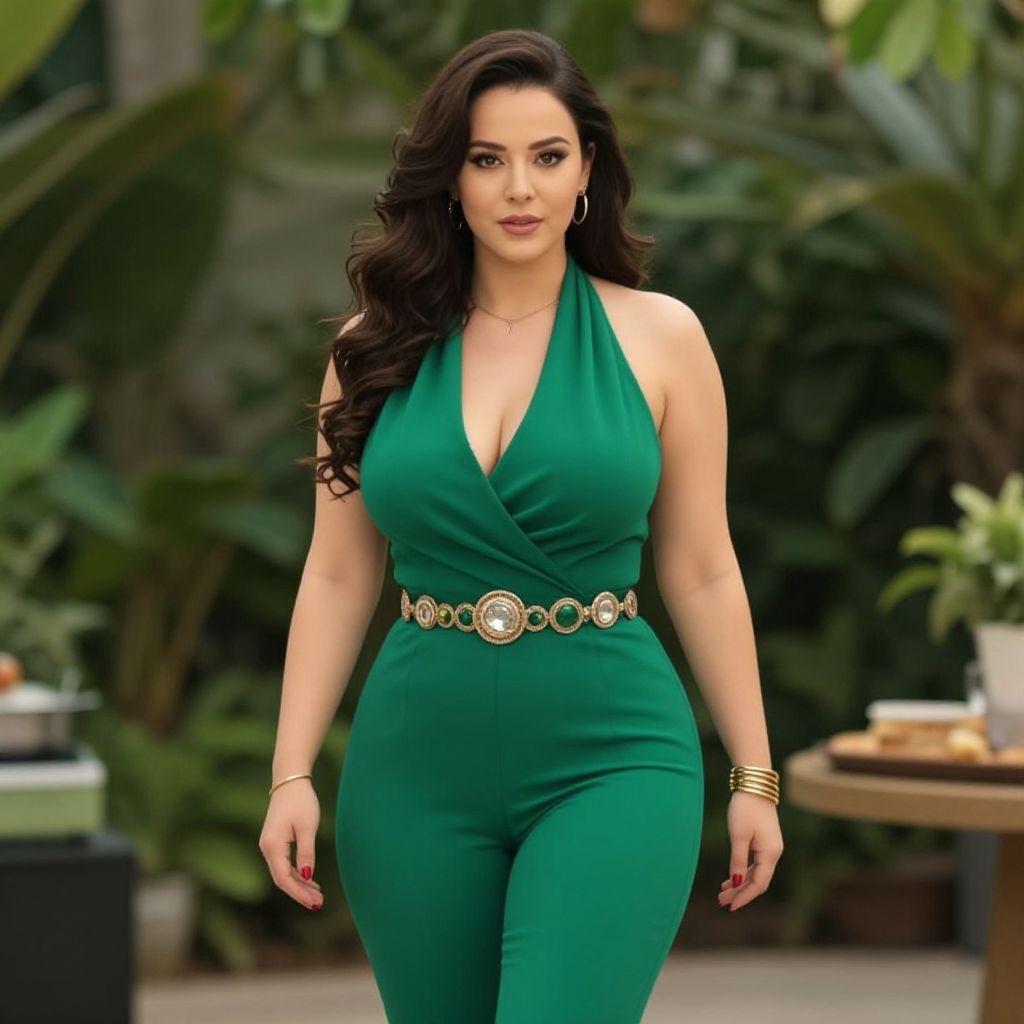 Photograph of a curvy woman with long, wavy, dark brown hair and fair skin, wearing a sleeveless, deep V-neck, emerald green jumpsuit with a gold belt featuring a circular design. She has large breasts and is accessorized with gold bracelets and a gold necklace. She stands confidently in an outdoor setting with lush green foliage in the background. A small wooden table with a potted plant and a stack of books is partially visible on the right. The image has a vibrant, high-contrast style, emphasizing her outfit and figure.