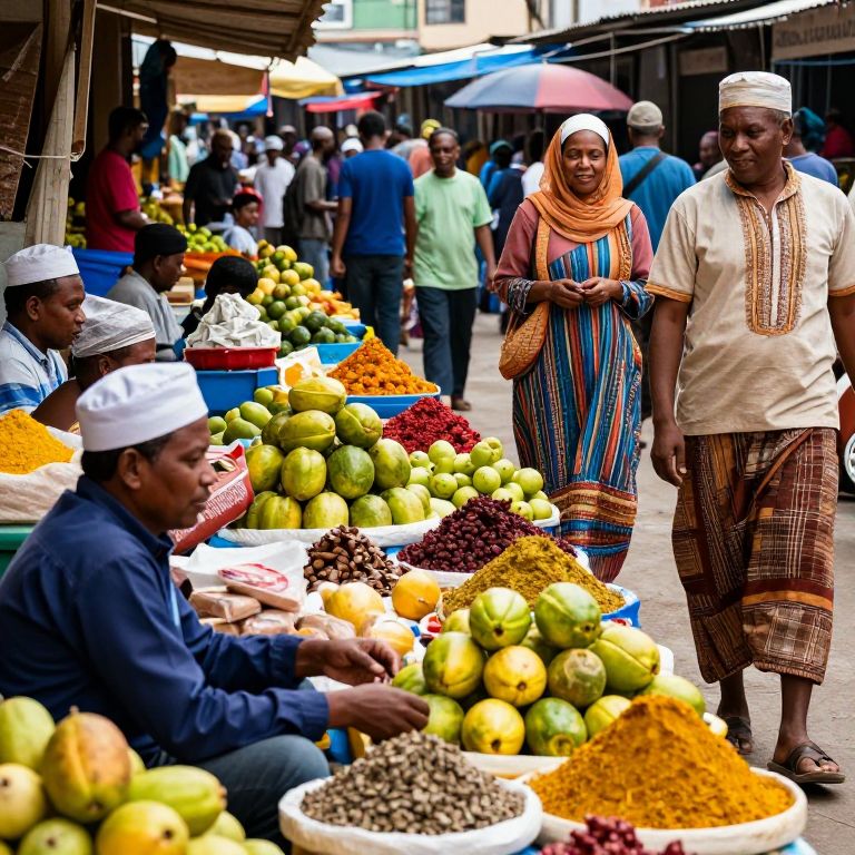 Colorful photograph of a bustling outdoor market: vendors selling bright spices, fruits, and vegetables; customers in traditional clothing and headscarves.