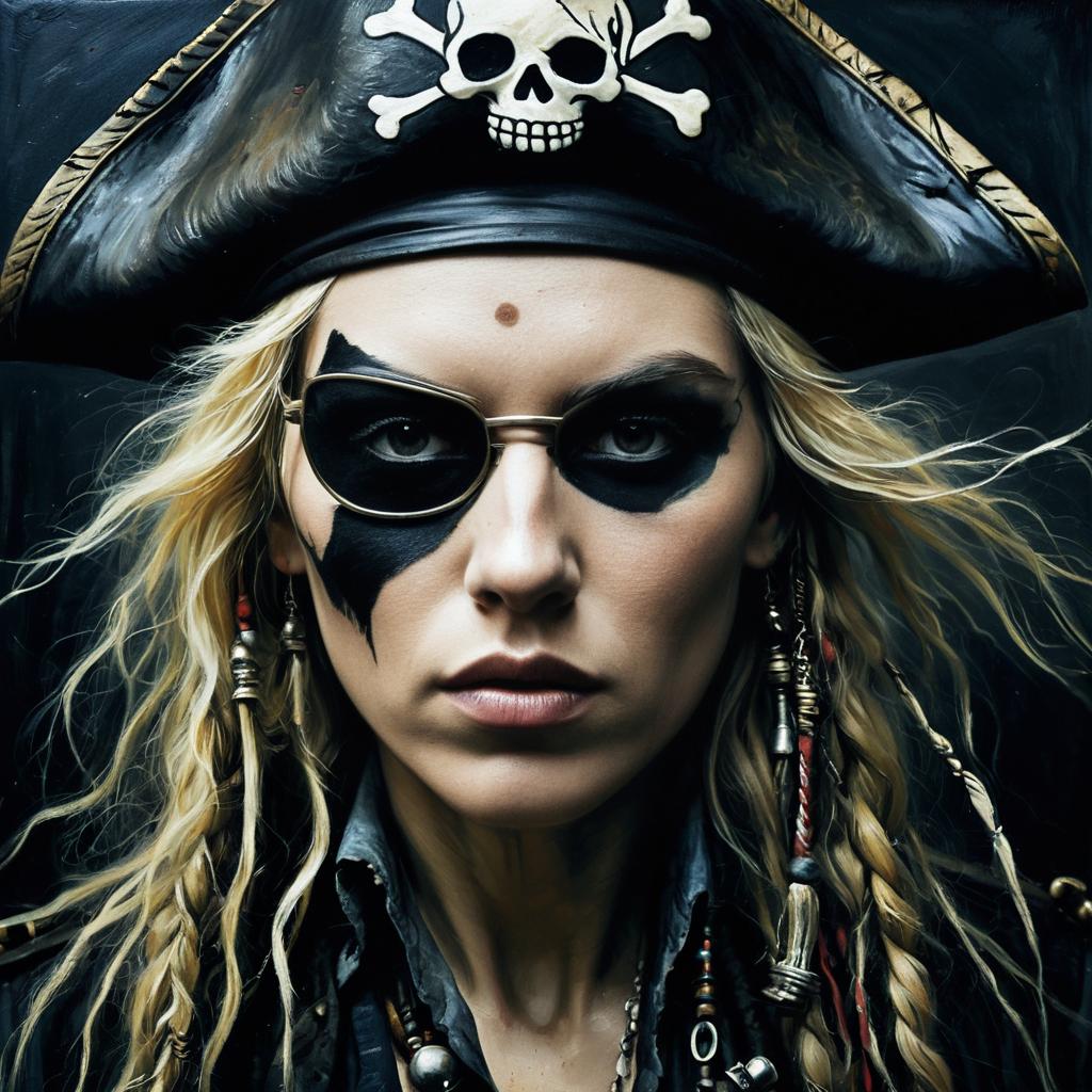 A detailed Hyper realistic portrait of a muted blonde rebel pirate laser-thrashed oil painting, in the style of Tim Burton, use a perfect blending of soft glow and eerie shadows to make this an eerie yet breathtaking image