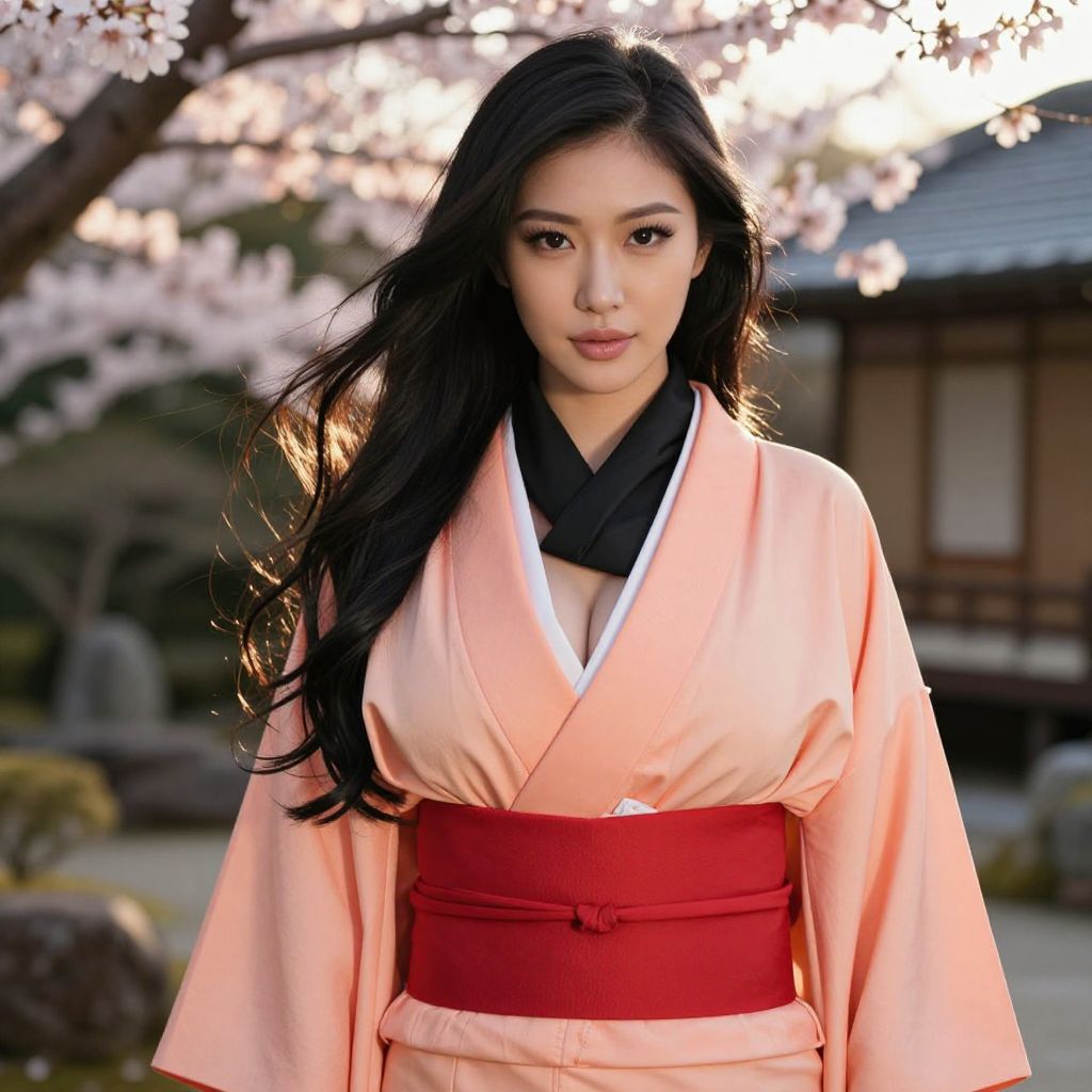 A beautiful Asian woman with long, flowing black hair, large breasts, and a sexy, alluring presence, wearing a vibrant peach kimono with a bold red sash and a sleek black scarf wrapped around her neck. The scene is set in a serene traditional Japanese garden at golden hour, with soft sunlight filtering through cherry blossoms, enhancing her elegant and sensual beauty. She stands gracefully, her expression calm and confident, exuding both grace and allure.