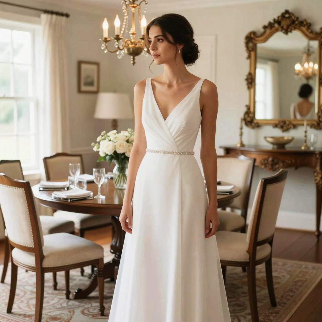Bridal Shower Attire, bride in a white dress standing in a room with a table and chairs