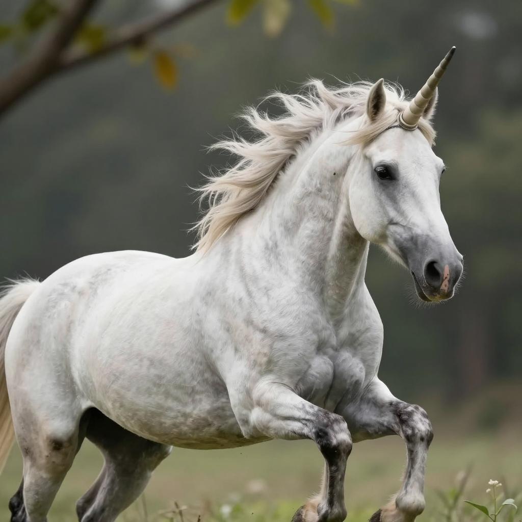 A galloping horse with a flowing mane and a visible unicorn horn. Tree branches with leaves are in the foreground and background. The horse's head is slightly tilted downward.