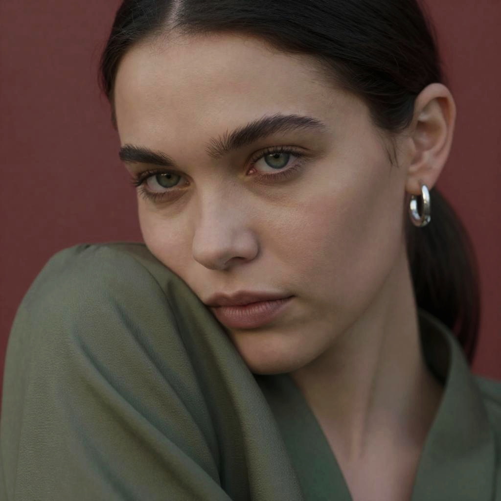 Close-up photograph of a woman with light skin and green eyes, gently hugging an olive green garment. She has dark hair pulled back and wears small, silver hoop earrings. Background is blurred red. Her face shows a calm, introspective expression.