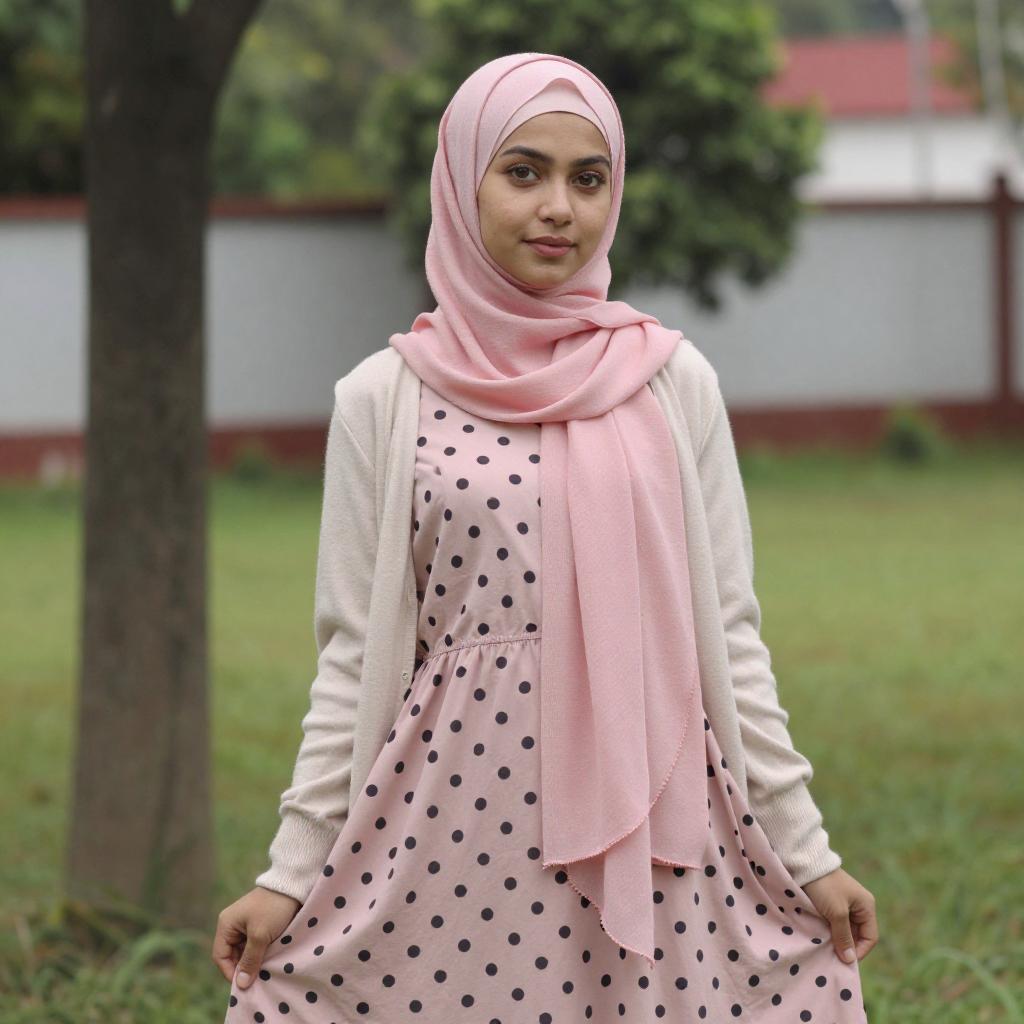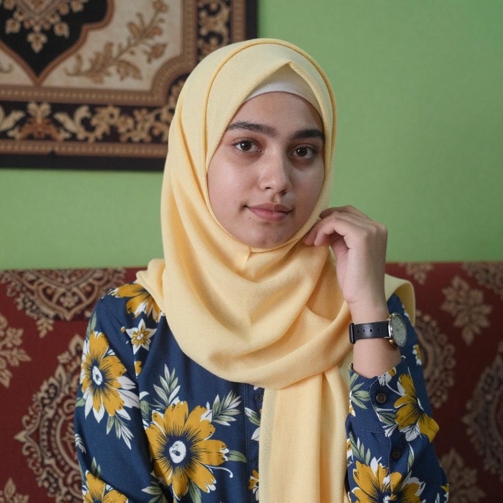 Photograph of a young woman with light brown skin and large brown eyes, wearing a lavender hoodie and a light pink hijab with floral patterns, covering her mouth with a pink face mask. She stands outdoors on a path with a blurred, green mountainous landscape in the background. Her hands are tucked into her hoodie pockets.