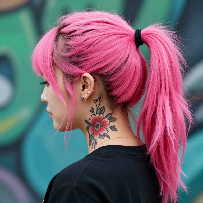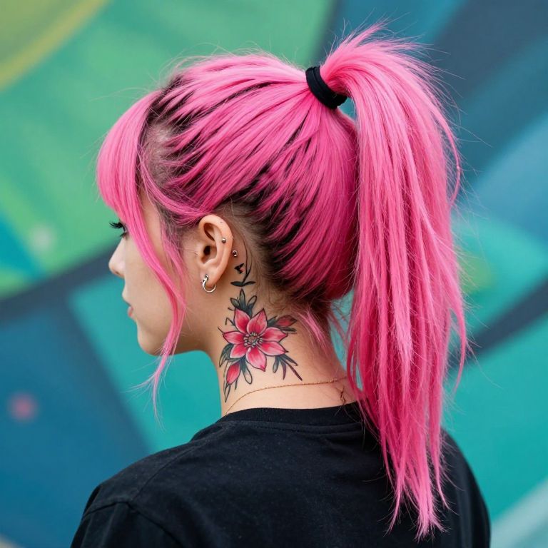 Photograph of a woman with vivid pink hair in a high ponytail, secured with a black hair tie. She is viewed from the side, showcasing a large, colorful floral tattoo on her neck extending to her ear. She wears a black top and has gold hoop earrings. The background features blurred, abstract blue and green patterns. Her hair contrasts sharply with the dark top and the colorful tattoo. The image has a bright, high-contrast style, highlighting the vibrant pink hair and tattoo.