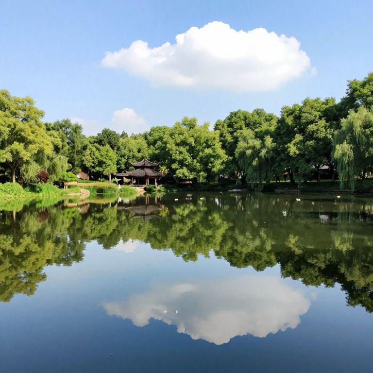 Serenity whispers through the still waters of the pond, mirroring the boundless sky and lush greenery, inviting a moment of peaceful contemplation amidst nature’s eternal embrace.
