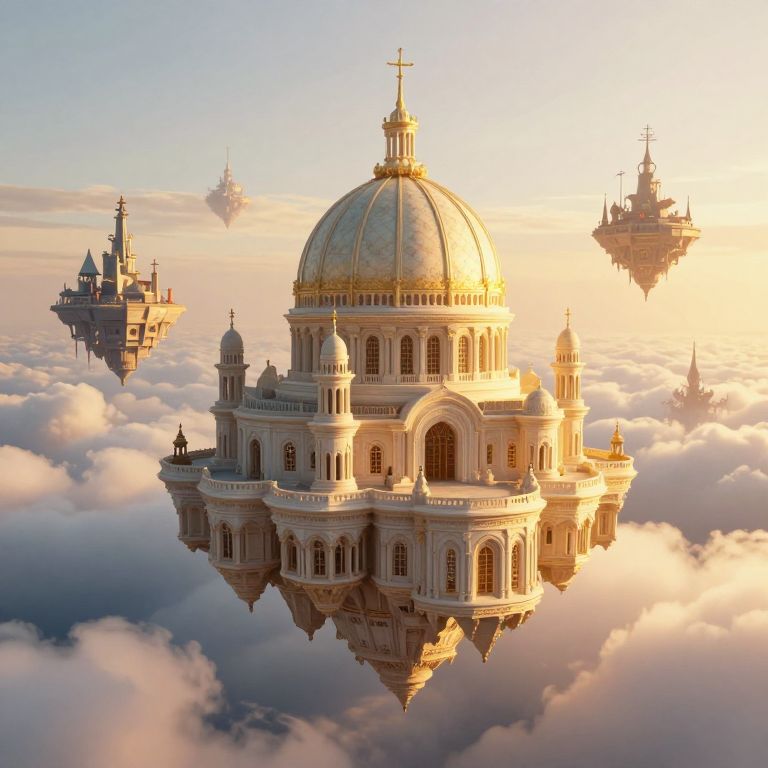 A luminous, otherworldly metropolis floats serenely above the clouds, its towering structures crowned with radiant domes and illuminated by bioluminescent spires, casting a magical reflection upon the ethereal mist below.