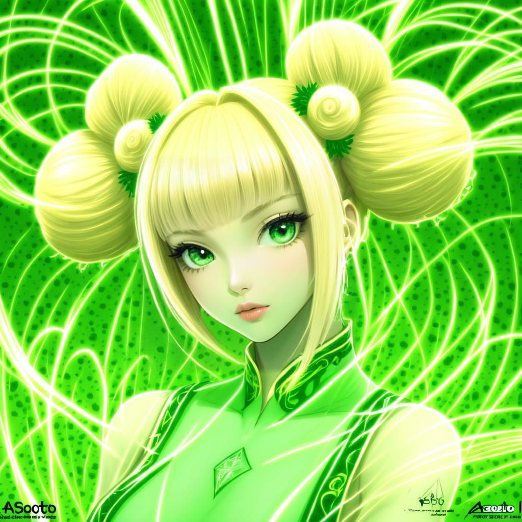 Aeru (simoun), simoun, 1girl, green eyes, blonde hair, double bun, by artist adsouto, anime