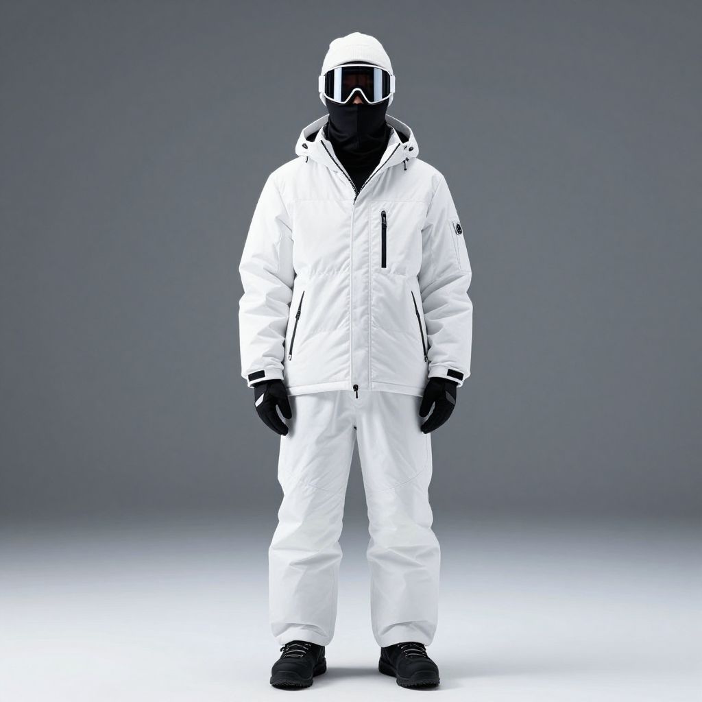 Photograph of a person standing against a gradient gray background. The individual is dressed in a full white winter outfit, including a hooded jacket with a front zipper, white pants, and black gloves. They wear a white ski mask that covers their entire face, except for the eyes, which are visible through black ski goggles. The person's stance is upright, with feet slightly apart and hands resting by their sides. The overall image has a high-contrast, monochromatic style, emphasizing the stark white of the outfit against the gray background. The lighting is even, with no visible shadows.