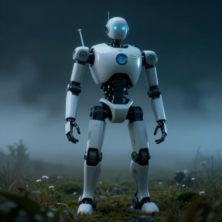 Hyperrealistic 4K image of a BRDF robot with glowing blue eyes and chest light, designed with a sleek white and black body. The robot stands in a foggy field at night, conveying a futuristic and slightly eerie atmosphere. The scene includes subtle details like grass and small flowers in the foreground, enhancing the immersive setting.