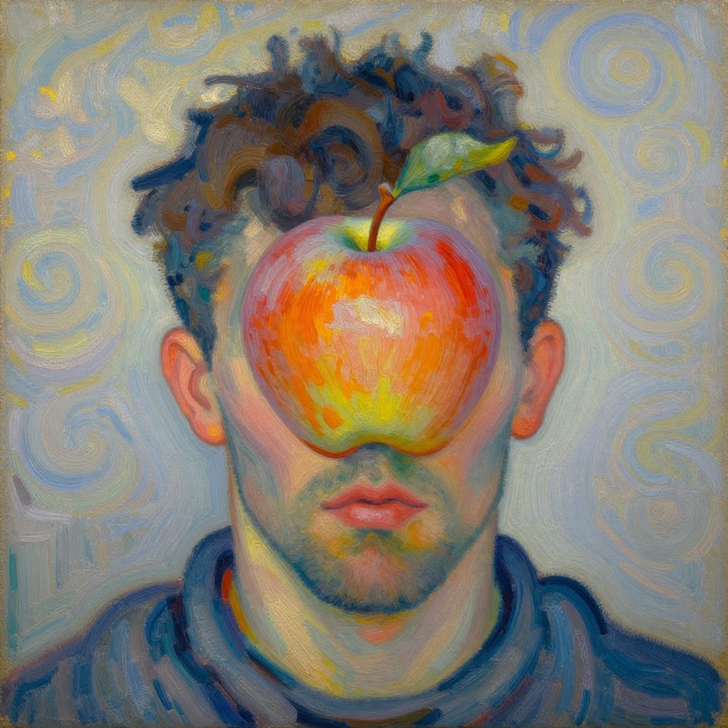 Expressionist painting of a man with curly brown hair, a large red apple covering his eyes, against a swirling blue and yellow background. Bold, vibrant