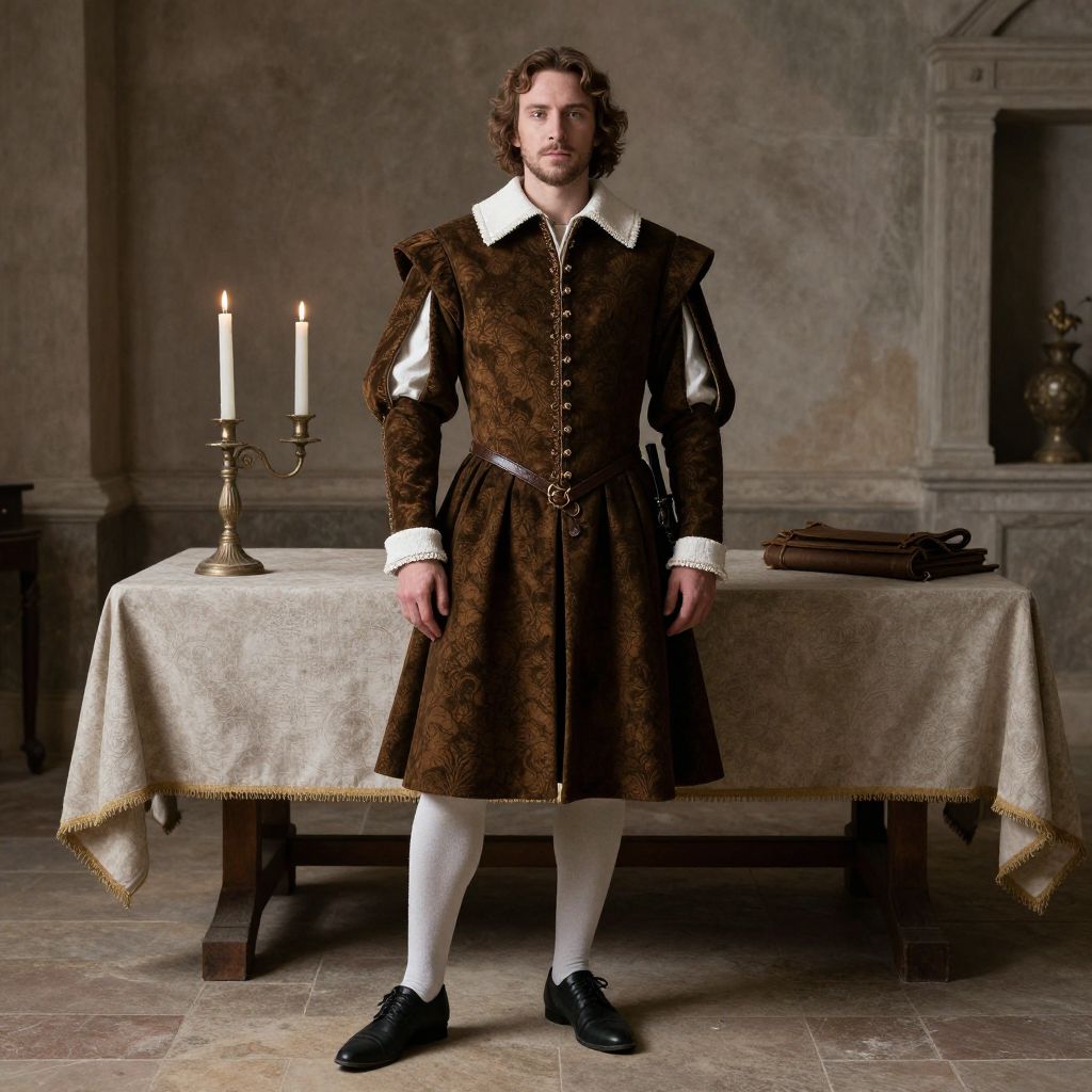 Historical Period Costume, man in a renaissance costume standing in front of a table