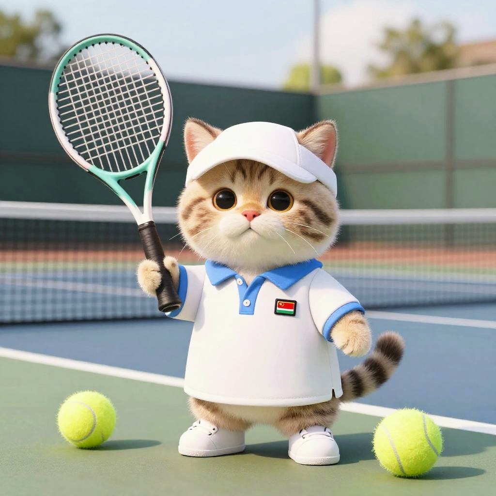 Tennis cat game concept art showing a cute kitten with oversized tennis gear, playful mood, soft pastel colors, whimsical outdoor tennis court setting