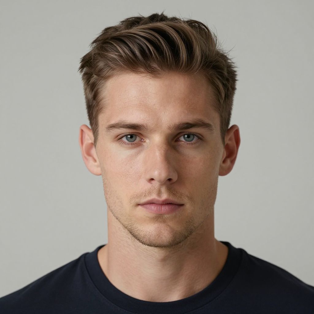 Textured Bowl Cut on a fit European man, lifestyle portrait, professional studio lighting, focusing on sleek hair contrast with skin, sharp edges, natural hair color