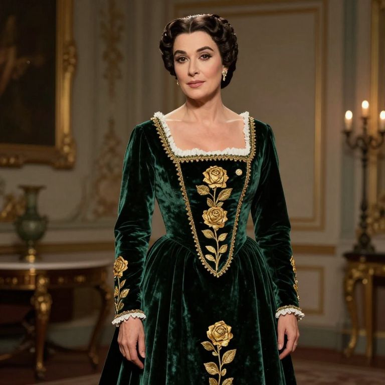 Spanish Art Maria Callas standing, dressed in medieval french green velvet dress, embroidered with golden roses.,