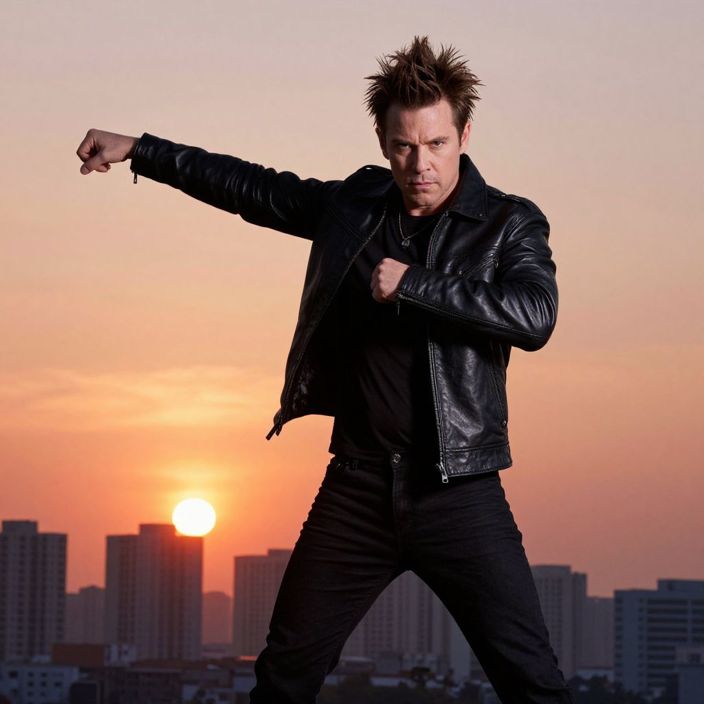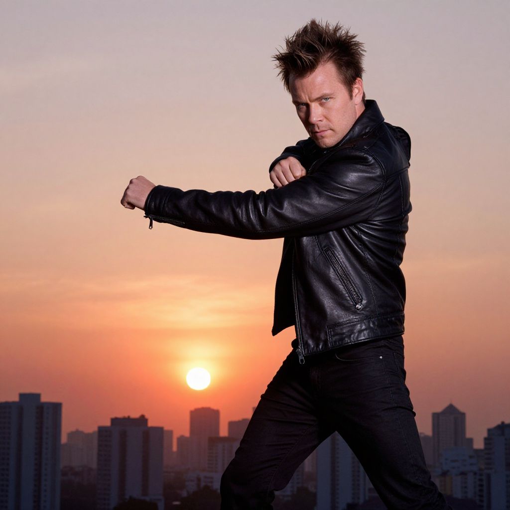 Photograph of a white man with spiky brown hair, wearing a black leather jacket and black pants, striking a dynamic pose with his arms outstretched against a vibrant sunset sky. The sun is low in the background, casting a warm orange and pink glow across the cityscape of tall buildings. His intense gaze is directed at the camera, adding a fierce, confident vibe.