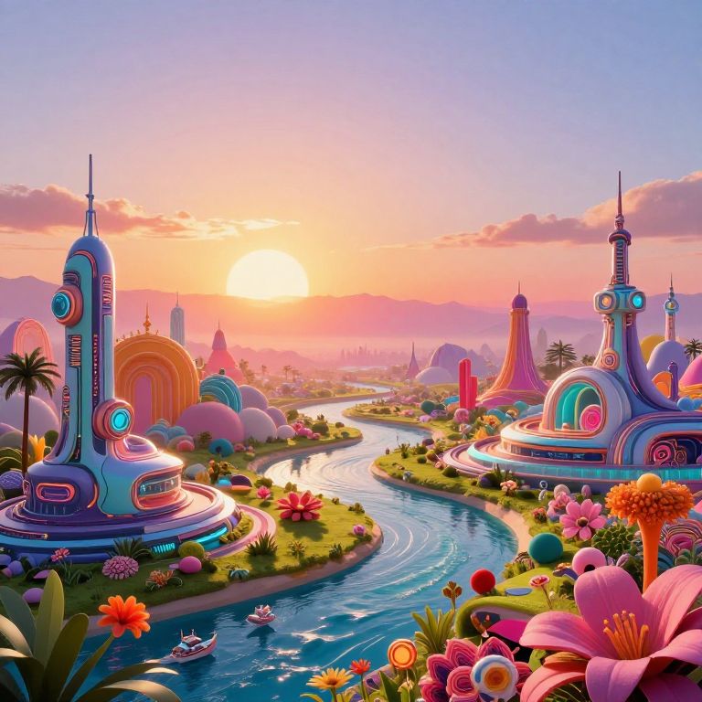 Vibrant, futuristic cityscape with neon-colored domed buildings, winding blue river, colorful flowers, sunset, and floating boat; digital art style