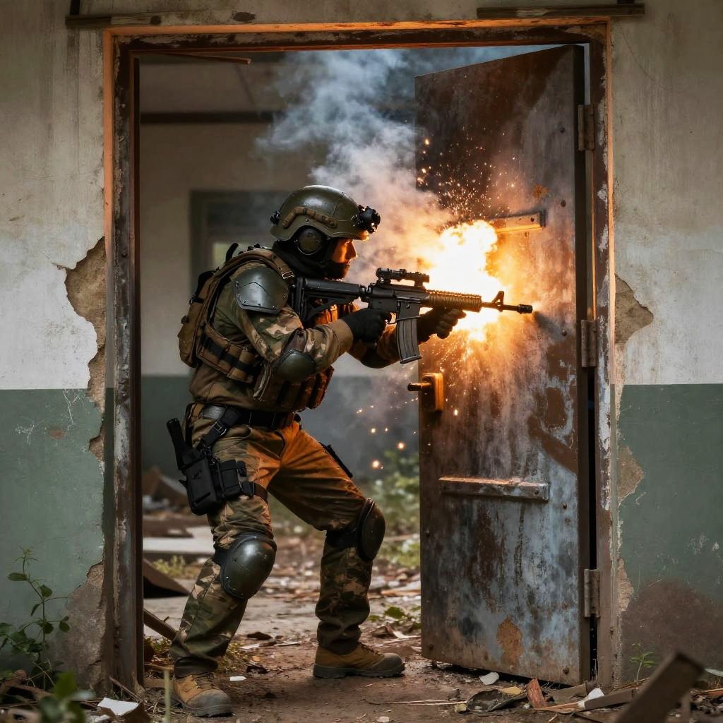 Random siege operator equipped with advanced armor and helmet, breaching a heavily fortified door in a dilapidated building, vibrant lighting from explosions, realistic military environment, focused expression, intense tactical operation