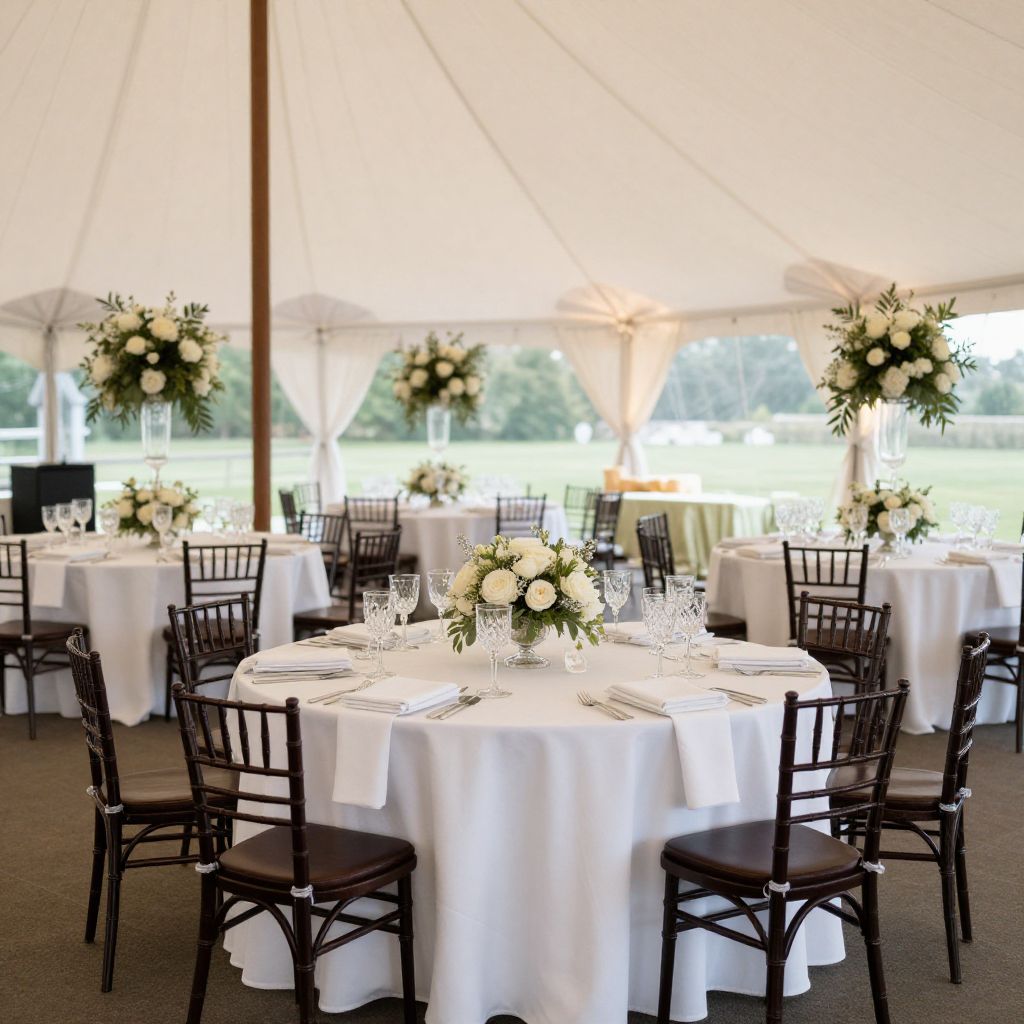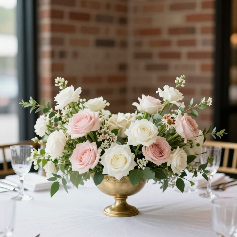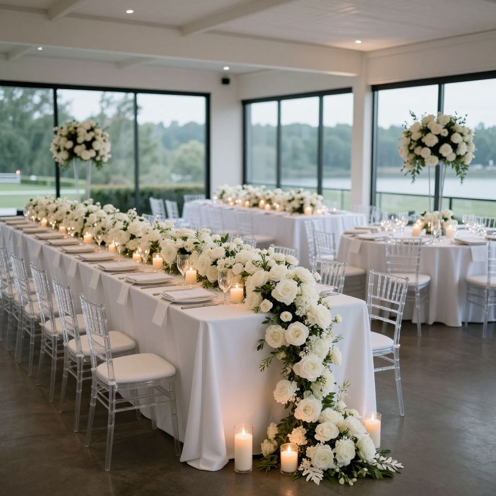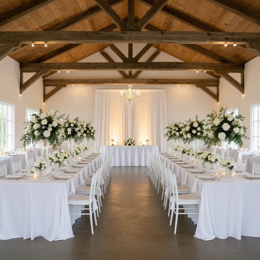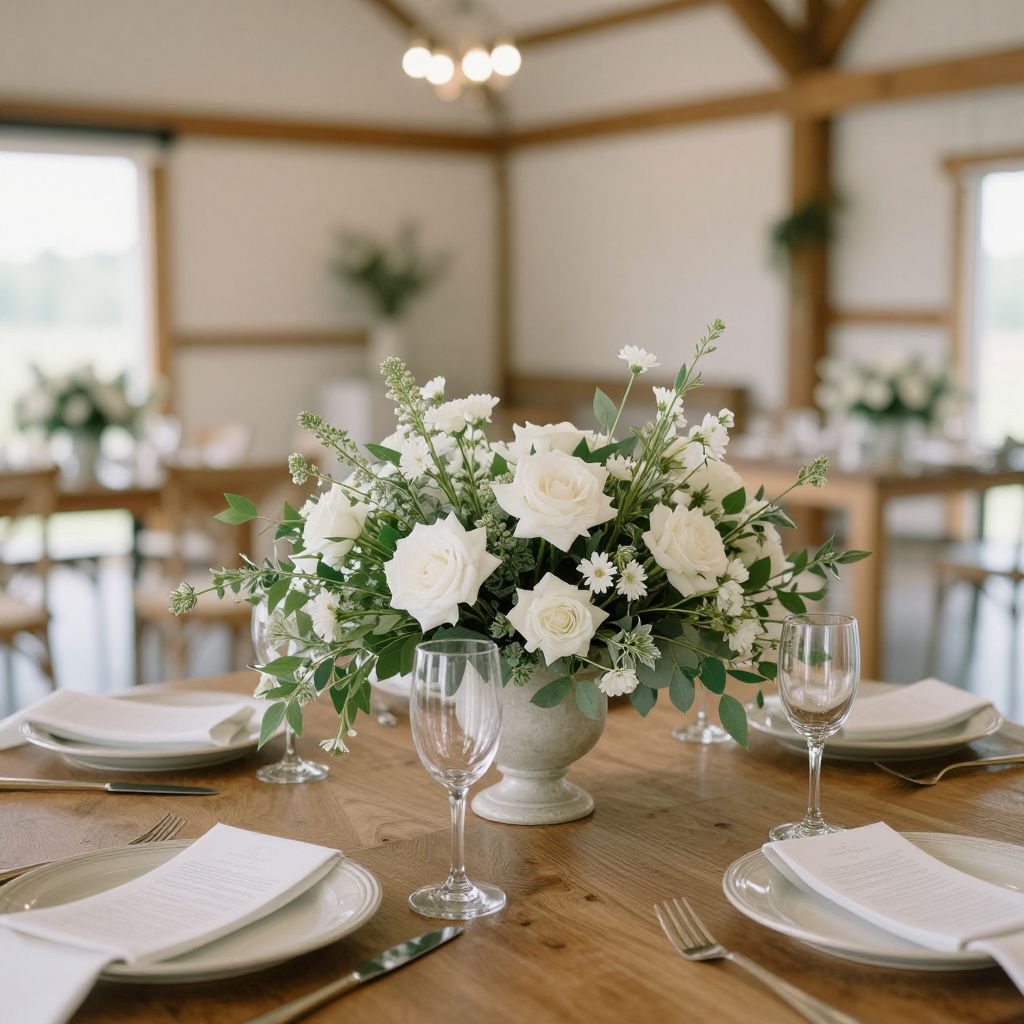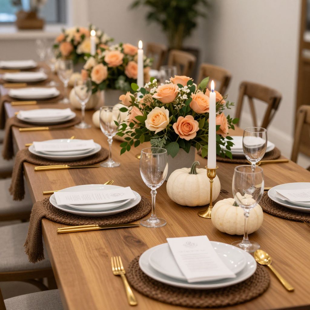 Elegant autumn-themed wedding table setup featuring two silver candelabras with lit white candles and a long, low floral centerpiece with sunflowers, daisies, and seasonal foliage. The rustic wedding venue is softly lit with wooden accents and white table linens, highlighting intimate and cozy decor details.
