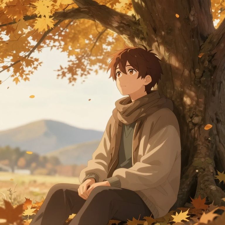 Brown hair anime boy sitting under an ancient oak tree during autumn, leaves falling around him in warm tones, realistic soft hair texture with natural highlights, cozy layered clothing, peaceful and contemplative mood, meticulous background with faded mountains