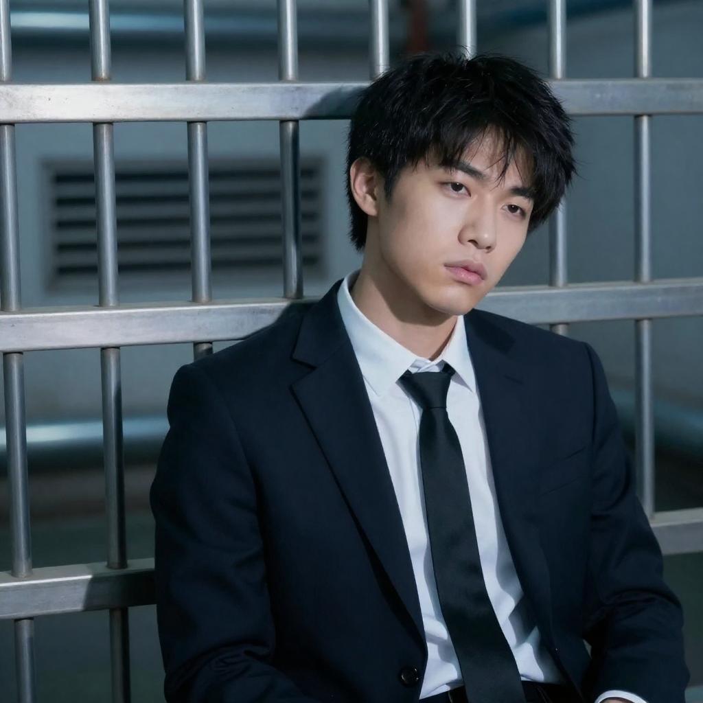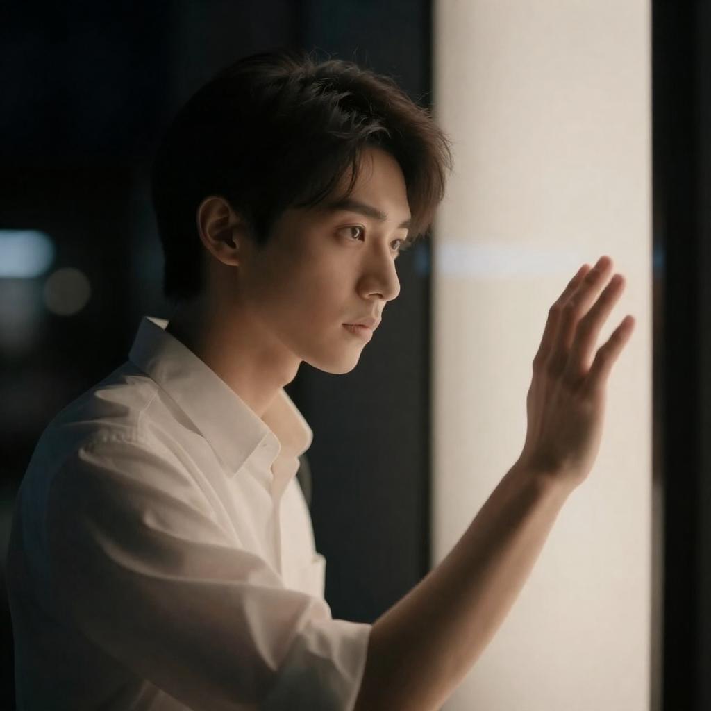 Male with short dark hair, white shirt, intense expression, touching illuminated wall panel with right hand, dimly lit background, night setting.